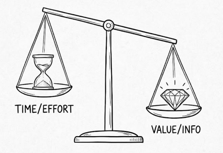 Jeder Klick und jeder Scrollvorgang verursacht für den Nutzer kognitive Kosten. Die Information Foraging Theory besagt dass ein Nutzer so lange auf einer Seite verweilt wie der Informationsgewinn pro Zeiteinheit hoch genug ist. Sobald der Aufwand zu groß wird oder die Information zu dünn gesät ist wandert der Nutzer ab.